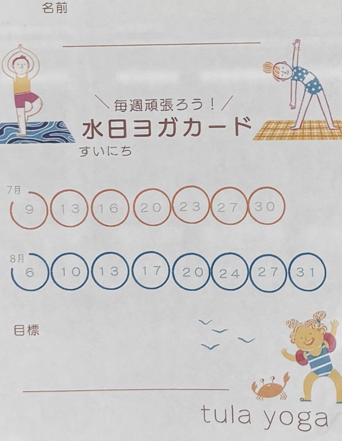 ①水日ヨガのどちらかの曜日をコンプリートで、 毎週一回ヨガ、この夏でスイニチヨガだけで、8回チケットで達成を目指す。